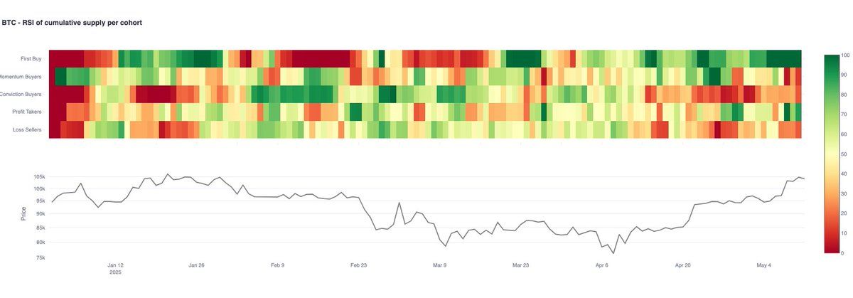 “BTC供应映射显示新需求持续强劲。首次购买者的相对强弱指数(RSI)在整个星期保持在100,”Glassnode在X上表示。
