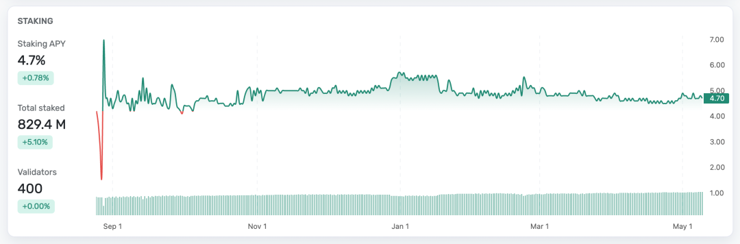 代币供应:TON token 最初供应量为 50 亿枚,供应无上限,以每年约 0.6% 的速度增长(约 3000 万枚),token 用于奖励验证者,若验证者行为不当,则其质押的代币会被 slash,目前可以通过质押 TON 获得约 4.7% 的 APY。