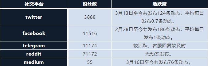 根据Medicohealth官网链接,其开通了twitter、facebook、telegram、reddit和medium,由于其reddit无动态发布故此工具粉丝数不计入在内,其社群人数共26633人(未去重)。综合观察来看,telegram活跃度高且客服回复也较为及时,facebook和twitter内容主要是项目宣传以及进展状况,facebook更新活跃,twitter、medium活跃度一般。