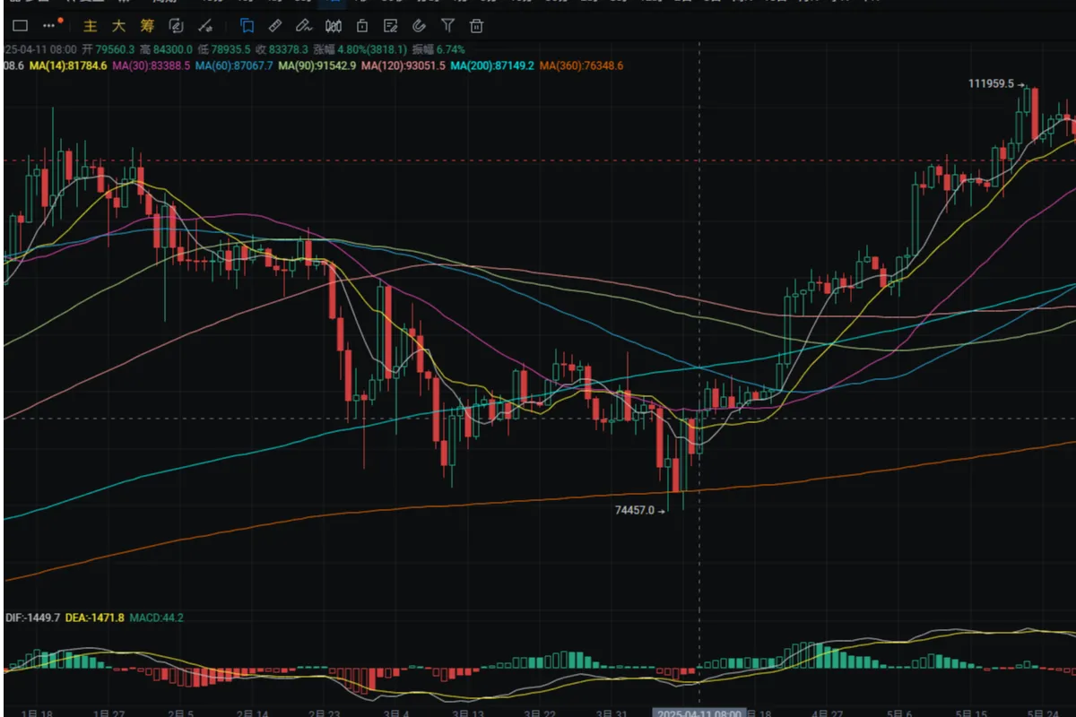 4小时线当前K柱呈红绿排列MA5日均线下压情绪出现缓和,但是10日均线和BOLL带中轨保持下压也说明短期上方存在较强抛压情绪,结合小时线来判断当前币价偏向小幅震荡调整,高点压制参考在106500-107700一线。低点支撑参考103700区域。币价反弹无法有效突破上方任意压制那么比特币将会再次试探103700一线支撑。所以凌晨个人看法保持先低哆后高箜思路。较为妥当。