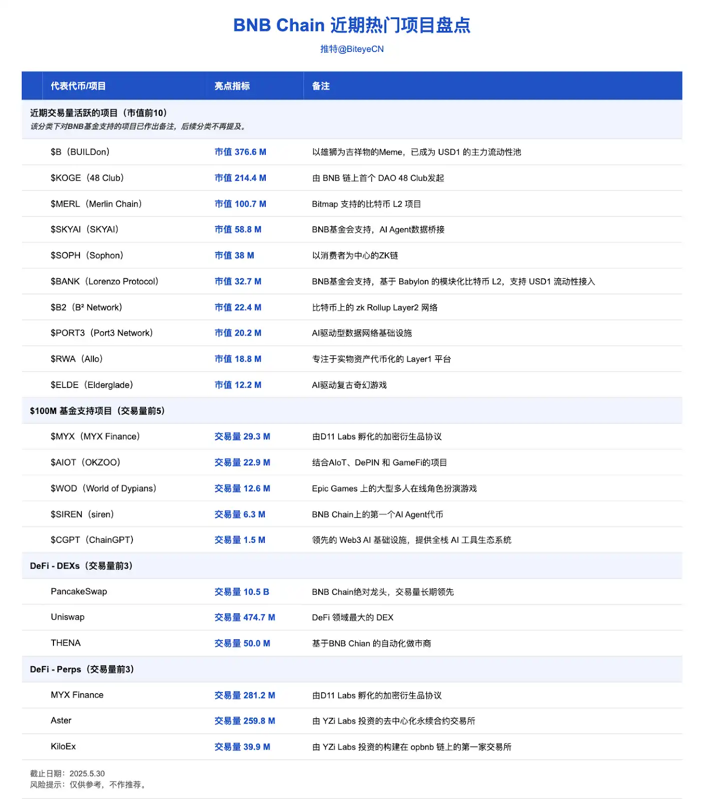 下表展现了当前 BNB Chain 生态不同分类下的热门项目,以及几大核心特征: