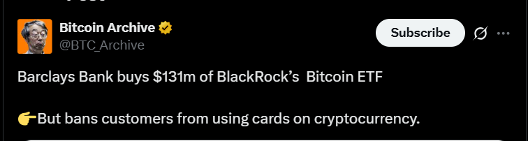 就在向黑石比特币ETF投资1.31亿美元的几天后,巴克莱银行的加密货币限制再次成为头条新闻。现在他们告诉客户:“您不能使用我们的卡购买资产。”