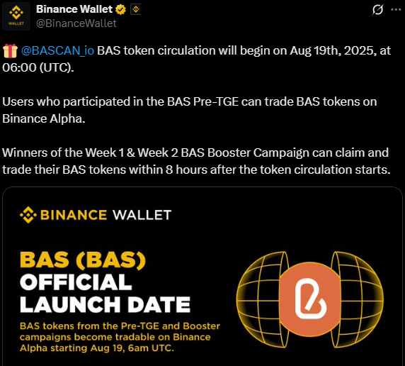 最新消息,BNB 认证服务代币(BAS)将于 2025 年 8 月 19 日上午 06:00(UTC)通过 Binance 钱包开始流通。参与 BAS 预 TGE 的用户将能够在 Binance Alpha 上开始交易,而来自 Booster 活动第一周和第二周的获胜者可以在流通开始后 8 小时内认领并交易他们的 $BAS。