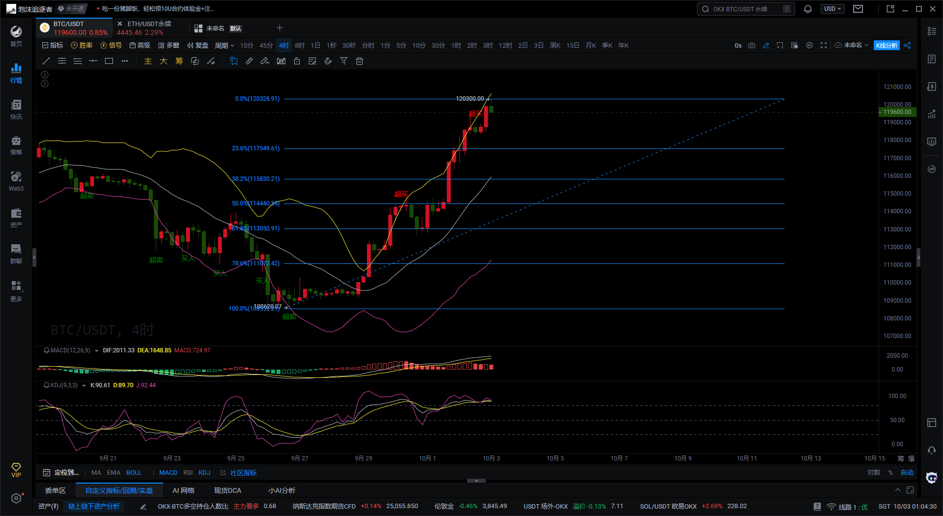 目前K、D、J三线值均处于90-92超买区,短线过热。J线值已拐头向下,显示出回调压力。若K、D线同步下行形成死叉信号,可能进入回调阶段。布林带指标显示出价格此前突破上轨至120300,目前回落至上轨附近。若站稳上轨,多头仍强劲;若跌破上轨,可能向中轨115,500靠近,与斐波那契38.2%~50%支撑区间重合,成为回调目标位。