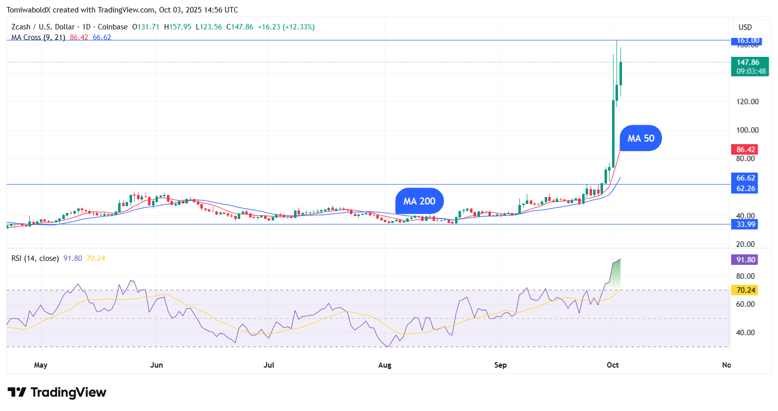Zcash 从9月28日的低点54美元连续上涨五天,至10月2日达到163美元,标志着201%的激增。