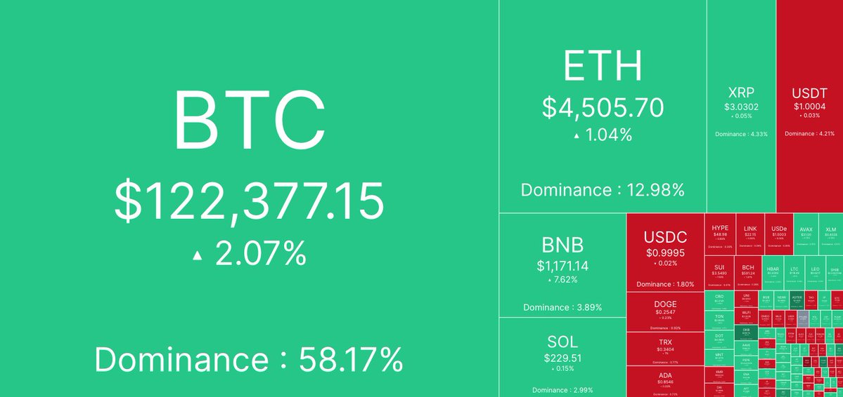 今天的加密市场继续异常活跃,比特币维持在$122,500左右,仅比历史最高点$123,874低约1%。
