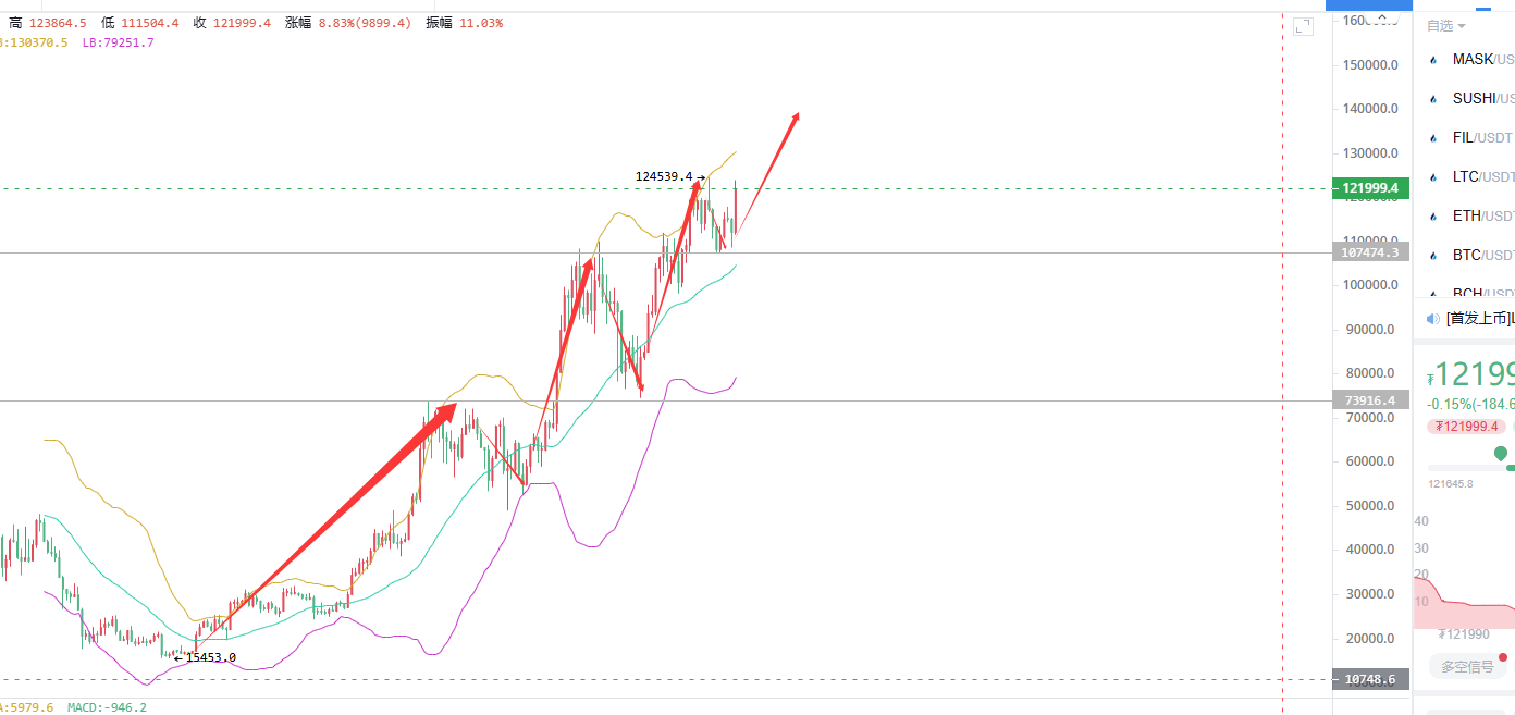 回顾本周行情,大饼从108900一线拉升至123860一线后回撤至122000一线开始震动。以太从3970一线拉升至 4589一线后回撤至4500一线开始震动。