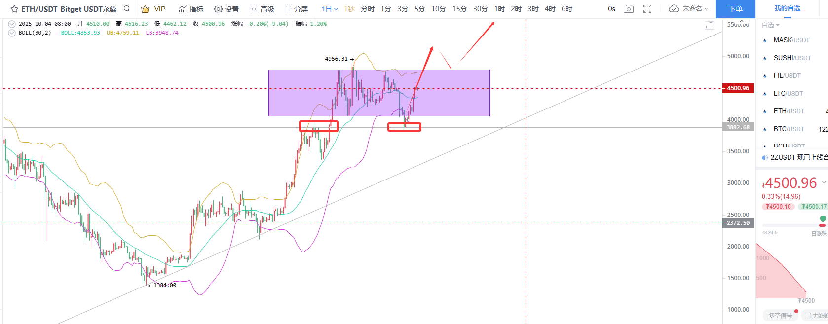 以太方面,从目前的日线去看,行情在经历了长达2个月的震荡之后,目前行情有了从新启动的趋势,在上周再次确定了下方3800一线的支撑并且清洗掉了上方跟随的多单后,情迎来了快速的反弹。目前再次回到了4000--4700的震荡区间内,但结合10月份的消息面及目前盘面所显示的走势去看,10月份以太大概率是要走出新高的 ,并且5000绝对不是这波行情的目标,只要在十月份突破5000那么大概率是要去冲击6000的。下周重点关注4000--4700震荡区间的突破情况,操作上和大饼一致采取回撤进多的思路去操作即可,下方关键位置关注4380---4250这两个位置的支撑情况,只要这两个位置不破,那么上到5000以上将是必然事件。