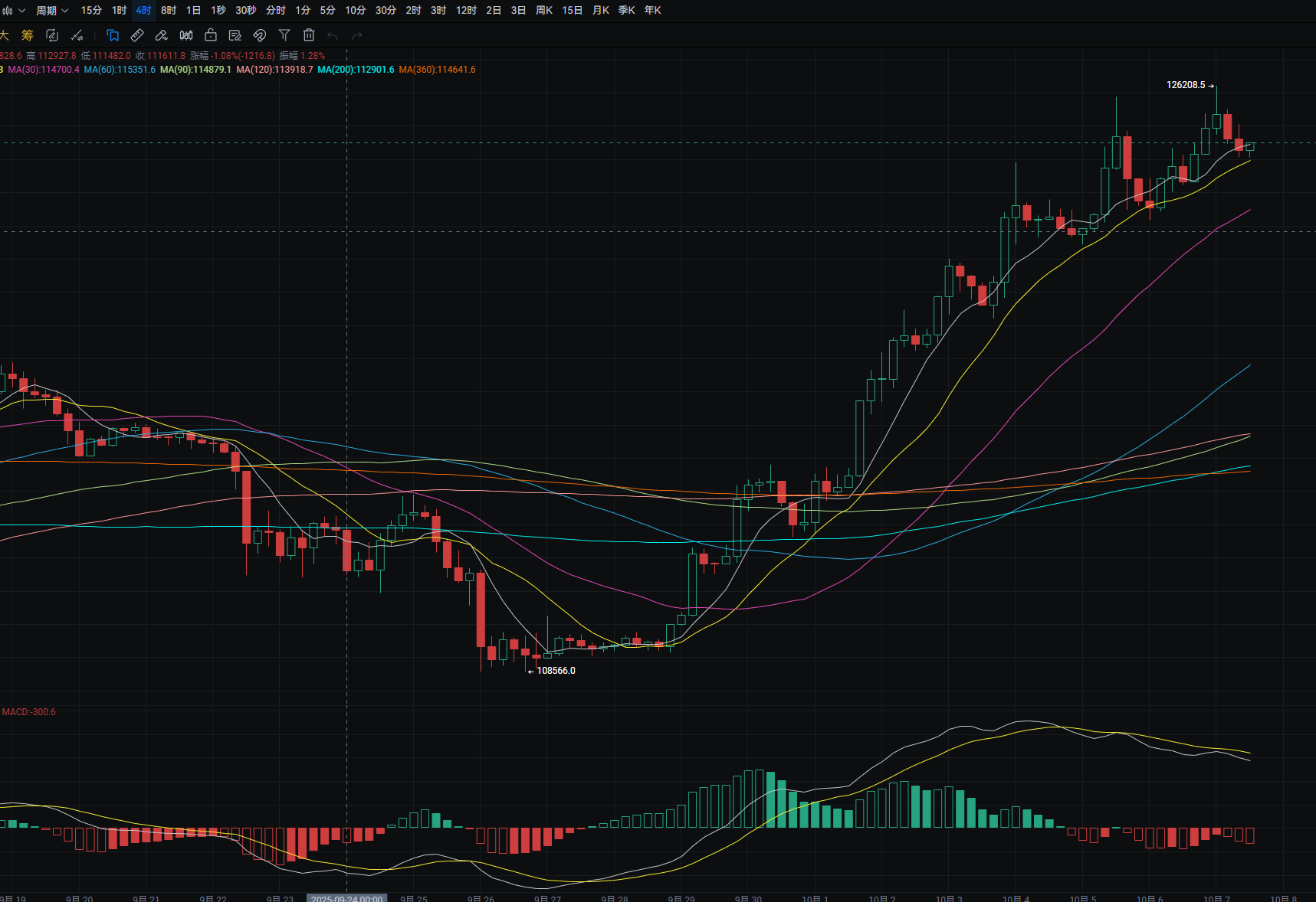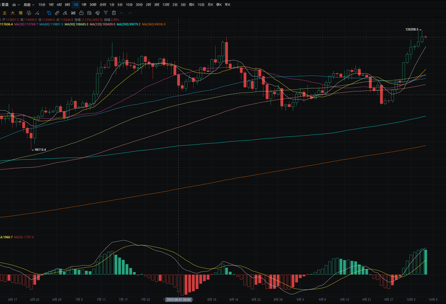 大饼日线昨日从最低123000附近上涨至最高126200附近 再次突破新高 收线在124650附近 下方支撑位于123400附近 跌破则可看至MA7均线附近 回踩可在附近进行接多 上方则可再次看至新高 MACD多头增量 四小时下方支撑位于123300附近 跌破则可看至MA30附近 回踩可在附近进行接多 上方压力位于125350附近 突破则可再次看至新高 MACD空头增量