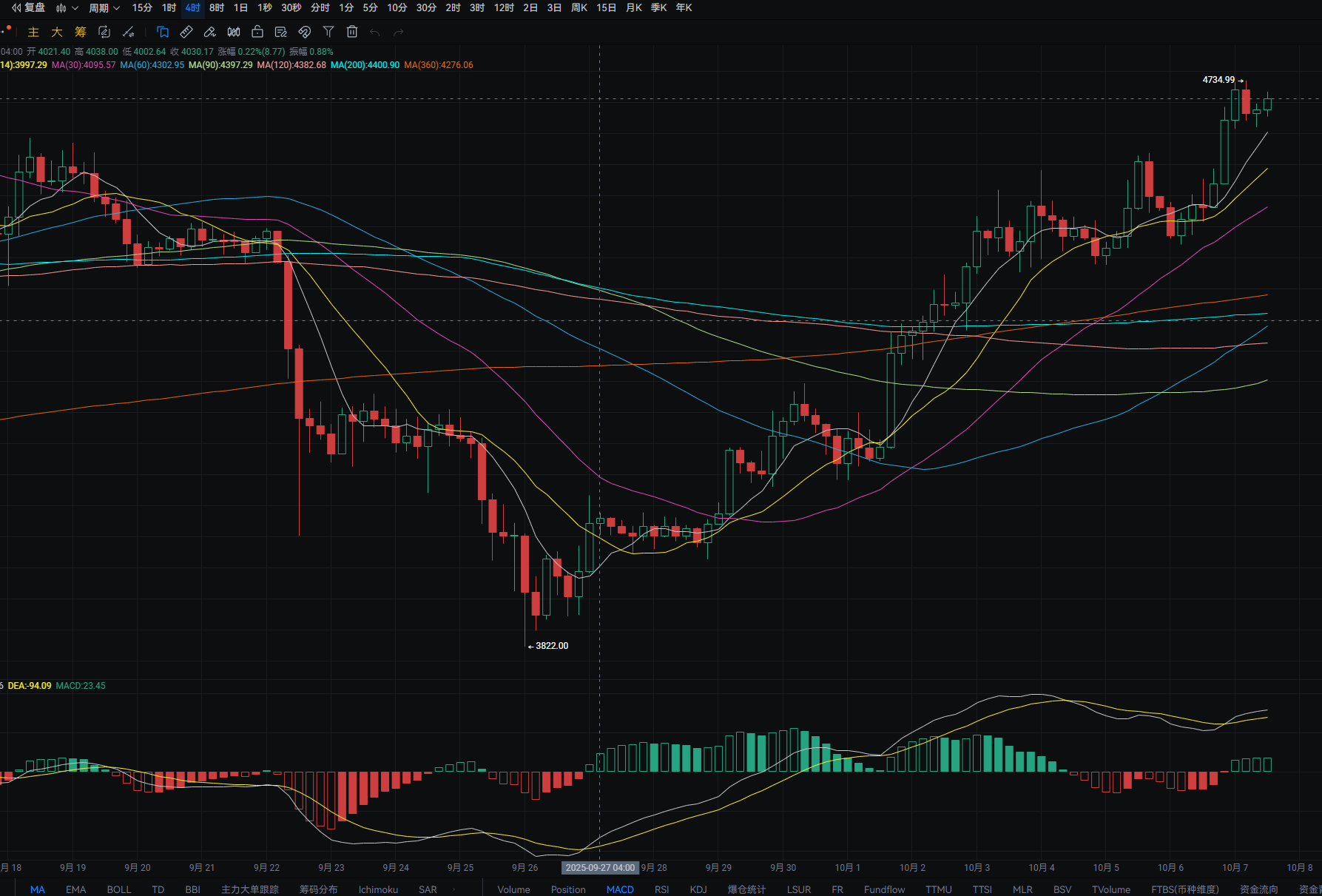 以太日线昨日从最低4485附近上涨至最高4735附近 收线在4680附近 下方支撑位于位于4585附近 跌破则可看至4465附近 回踩可在附近进行接多 上方压力位于4830附近 突破则可看至新高 MACD多头增量 四小时下方支撑位于4605附近 跌破则可看至MA30附近 回踩可在附近进行接多 上方压力位于4750附近 突破则可看至4830附近 反弹至附近可进行接空 MACD多头增量 形成金叉