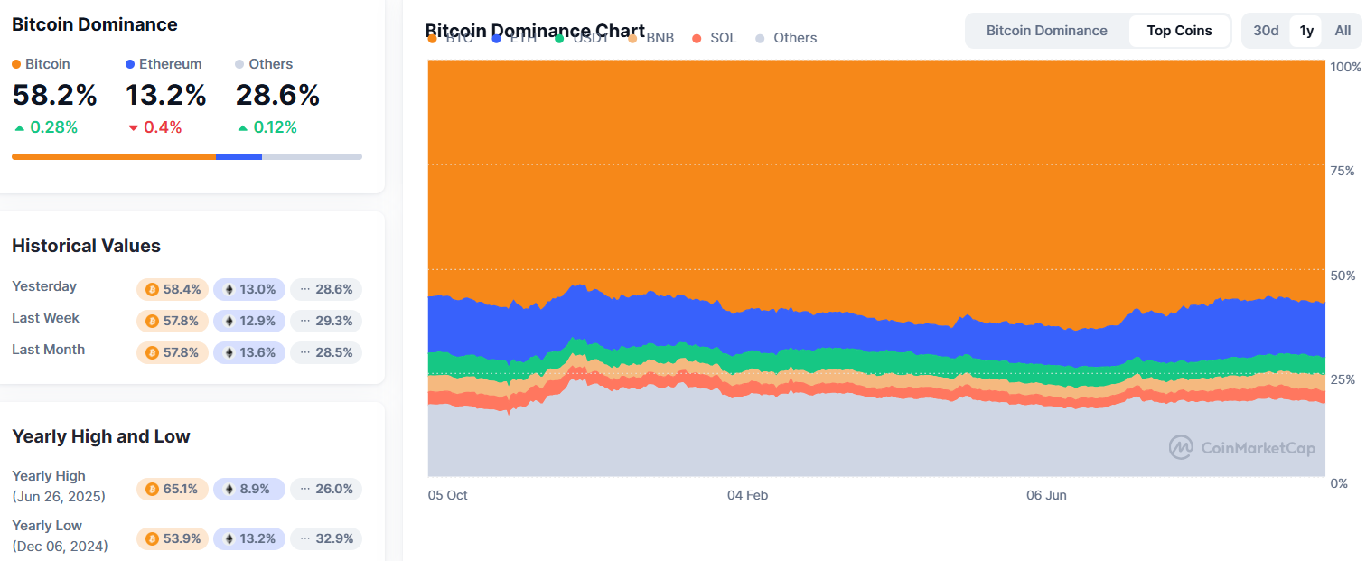 此次反弹的一个显著方面是其分布情况。比特币的主导地位——其在总加密市场市值中的份额——正在上升,最近突破了58%。换句话说,这次反弹是由比特币主导,而不是山寨币,这通常表明机构参与而非零售参与。机构投资者压倒性地更喜欢比特币的流动性和监管透明度,而不是较小的代币——尽管这种情况开始有所变化。