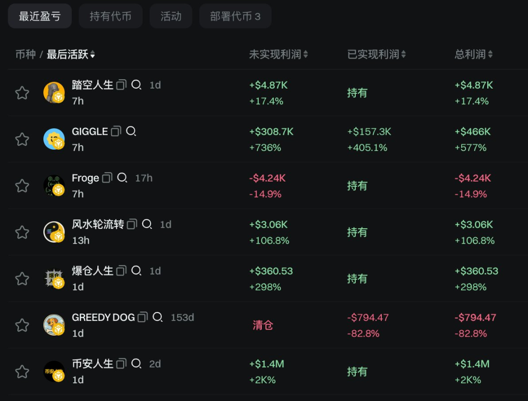 据 AI 姨监测到的某位 P 小将过去 24 小时交易了 65 个 BNB Chain 上的 meme 币,包括卑微小何 / 主播小赵 / 币安社区 / 中文 / 币安吉祥物 / 币安合伙人等中文 ticker,他的策略是广撒网的买 100-300 刀,还不错的买 1000-3000 刀,近七日累计获利 8.7 万美元。
