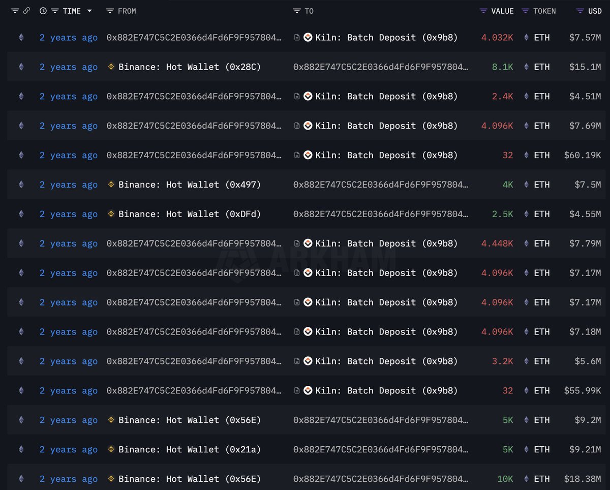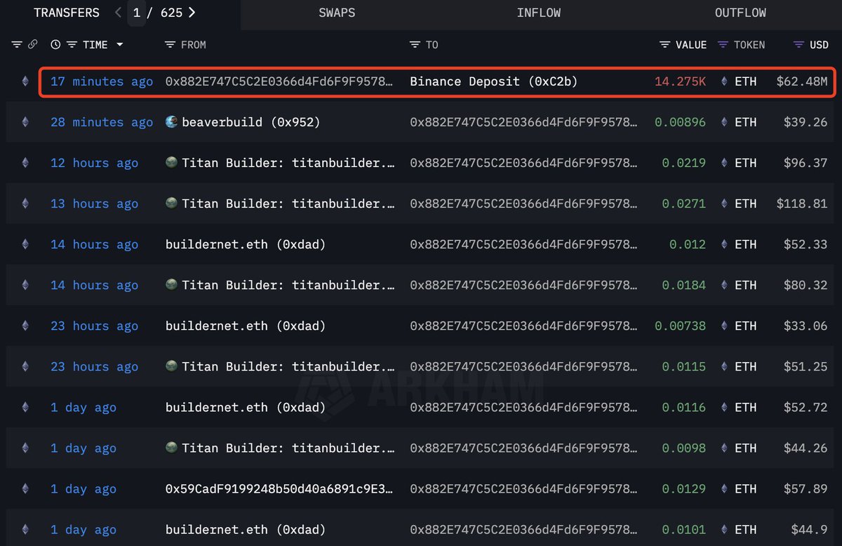 鲸鱼0x882E刚刚在#Binance存入了另外14,275个$ETH($62.48M)。