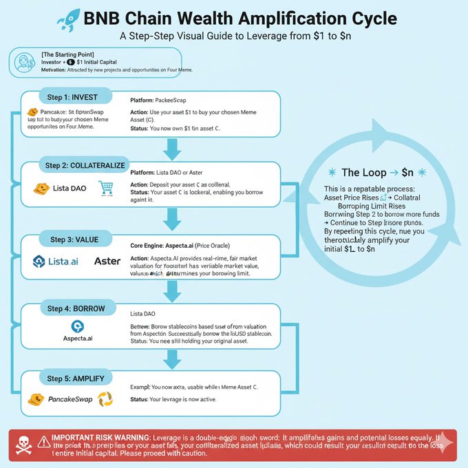 Four.Meme (入口) ➔ PancakeSwap/Aster (交易) ➔ Aster/Lista (加杠杆) ➔ PancakeSwap (再投资)