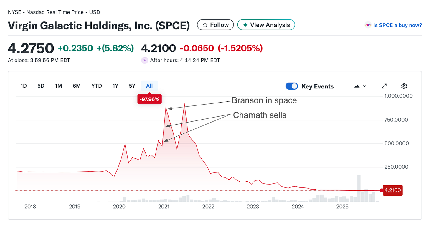 • 特殊目的收购公司(SPAC )的发起人赚得八位数的利润,他们赚得数千万,而他们推广的股票却下跌了99%以上。维珍银河(Virgin Galactic)在将理查德·布兰森送上太空时曾有过高光时刻,创造了辉煌的纪录。而查马斯(Chamath)则带着 3.15 亿美元离场。看看普通股东的表现吧: