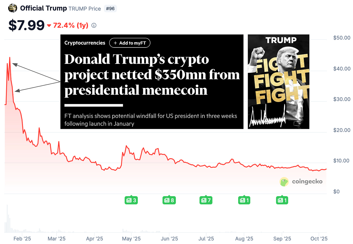 每天都有新的加密 memecoin 诞生,有时是 100 个,有时是 1000 个。甚至连白宫也卷入其中。$TRUMP 最初以不到 1 美元发行,飙升至超过 40 美元,然后又跌回地面。内部人士仍然获得了约 8 倍的收益。特朗普家族早早套现了约3.5亿美元。堪称 SPAC 和国库公司的“升级版”。