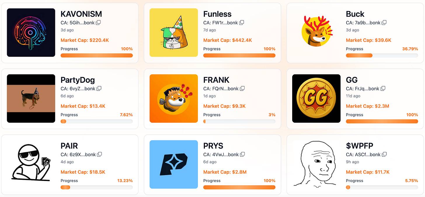 许多泡沫规模很小,消失得也很快,就像前面提到的果蝇。大多数代币的市值甚至无法突破 100 万美元。以下是一些最近的例子,比如 Bonk.fun 的 $FUNLESS,看起来它能给投资者带来的“乐趣”就像 $USELESS 的“用途”一样少。这真是“广告即真相”的典范。
