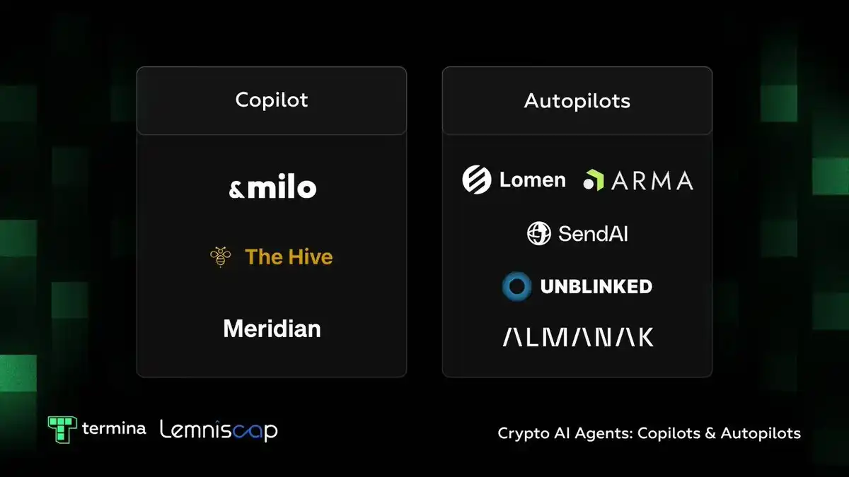 一类是 Copilots,它们引导用户在整个 DeFi 世界中做出决策;另一类是 Quant Agents,更偏向专业自动化策略执行,相当于「自动驾驶(Autopilots)」。