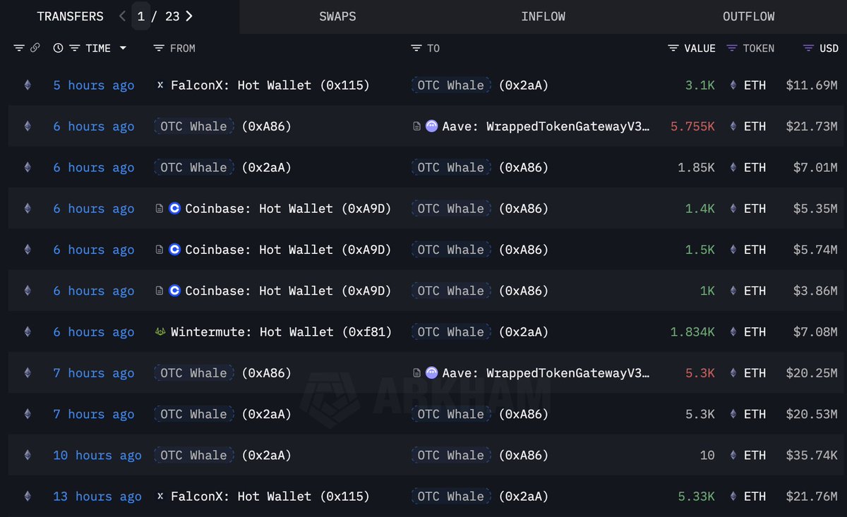 场外交易鲸鱼通过 #FalconX、#Coinbase 和 #Wintermute 购买了 14,165 $ETH(价值 5550 万美元)。