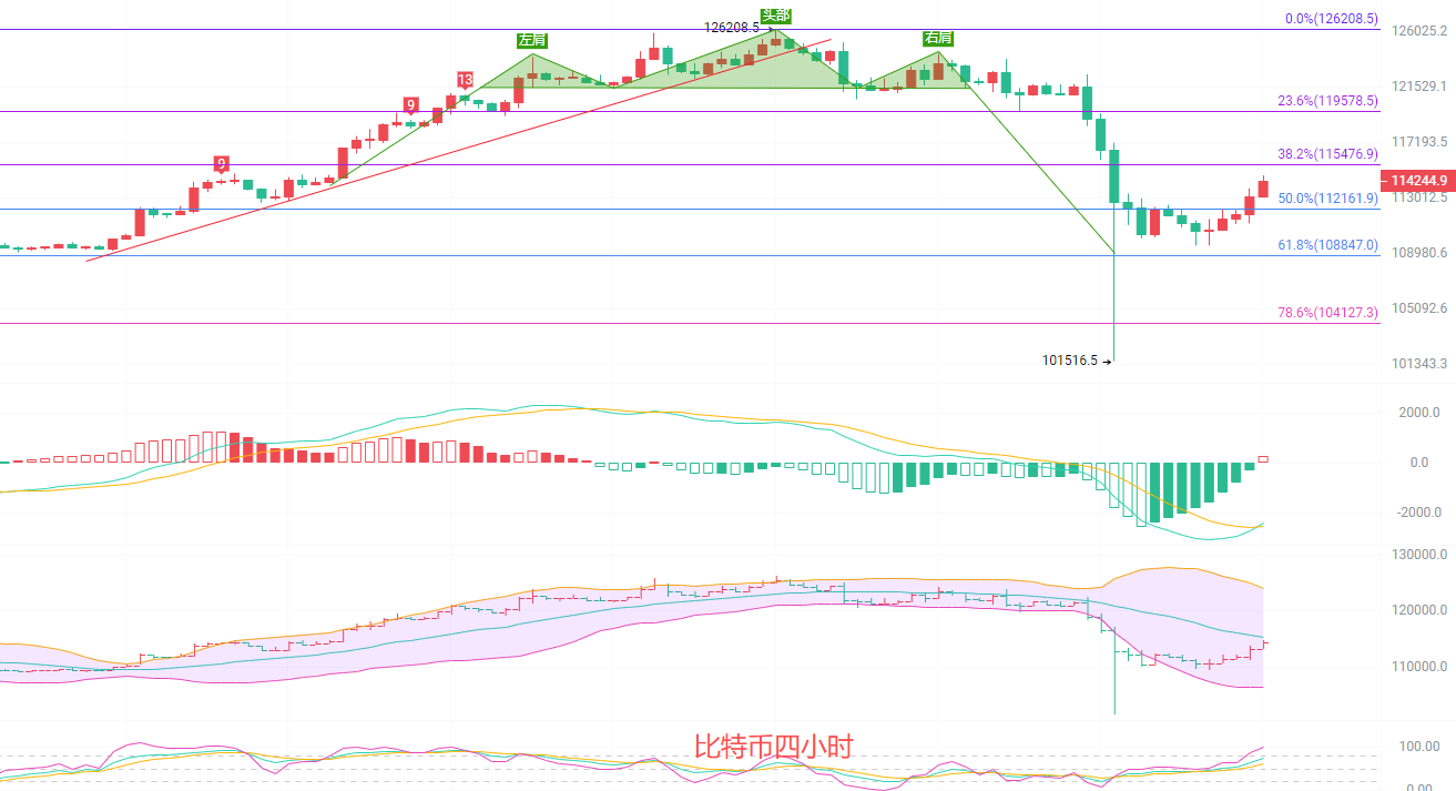四小时K线追上了EMA15趋势快线阻力113800,趋势指标向下扩散趋势减速,阻力位关注382压力115500,MACD缩量结束开始放量DIF和DEA出现金叉,K线来到了布林带中规115250下方,短期内有冲击趋势压力位的可能,这个时候不管能否突破关键阻力,行情进入了交易范围以后才可以出手,在这之前等机会,等信号