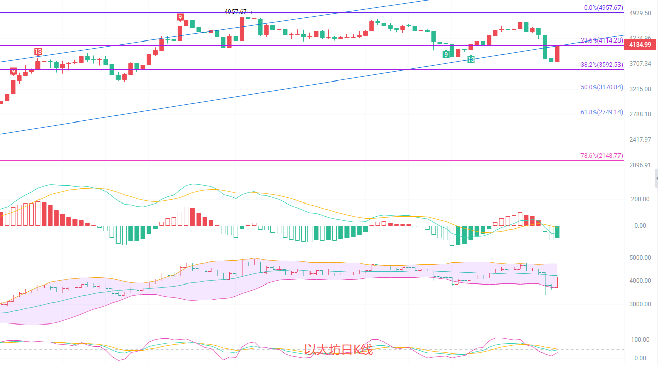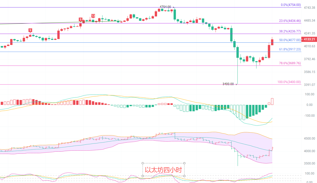日K线发稿前最高4175,最低3692,一更大阳线扳回拉伸破了120个90EAM趋势指标,现在 开始冲击EMA60阻力位4200,和布林带中规阻力4240,MACD空头缩量增筹结束,多头开始发力,盘口还没有彻底扭转,但是多头拉伸的趋势确实存在,关注关键阻力位4230到4290区间的盘口在决定多还是空