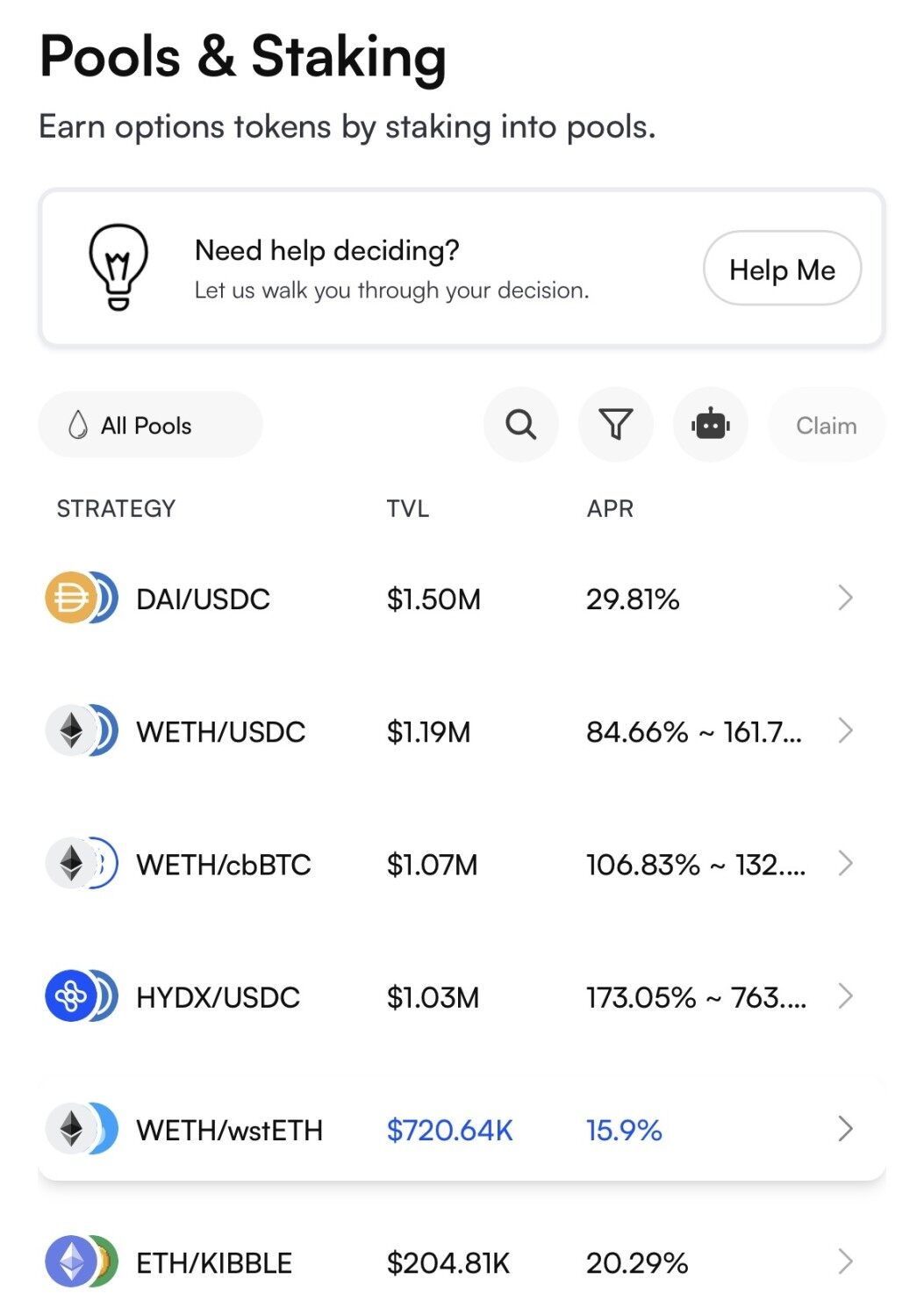 也可通过 Base App、钱包等通过流动性池质押获取年化收益,其中稳定币策略对 DAI/USDC 的 TVL 为 150 万美元,年化收益率为 29.81 %。USDC/HYDX 的 TVL 超 100 万美元,年化收益率最高达 774%。