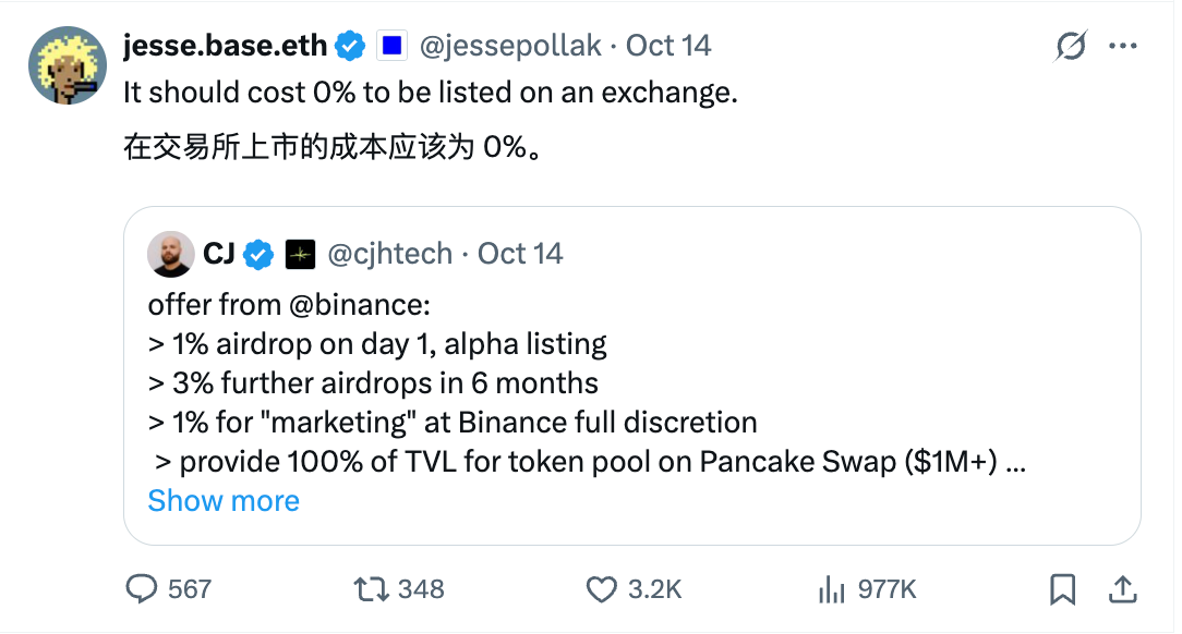 Jesse 对这一推文也给出了自己的支持,再次强调 CEX 上币费应当为 0。