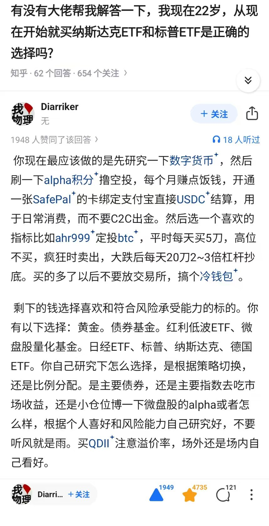 而最近刷到《人生作弊法则》这个帖子在推特上很火,我认为也很好回答了这个问题。该回答大意是:先研究数字货币,通过刷 Alpha 撸空投积累资金,再开一张 SafePal 的卡把撸空投赚的钱用于日常消费,再选择一个定投指标 AHR999 定投 BTC,剩下的钱就选择合适的标的投资即可。今天,我们就来介绍一下定投和如何使用 AHR999 定投指标,让你慢慢变富,不再为爆仓困扰!