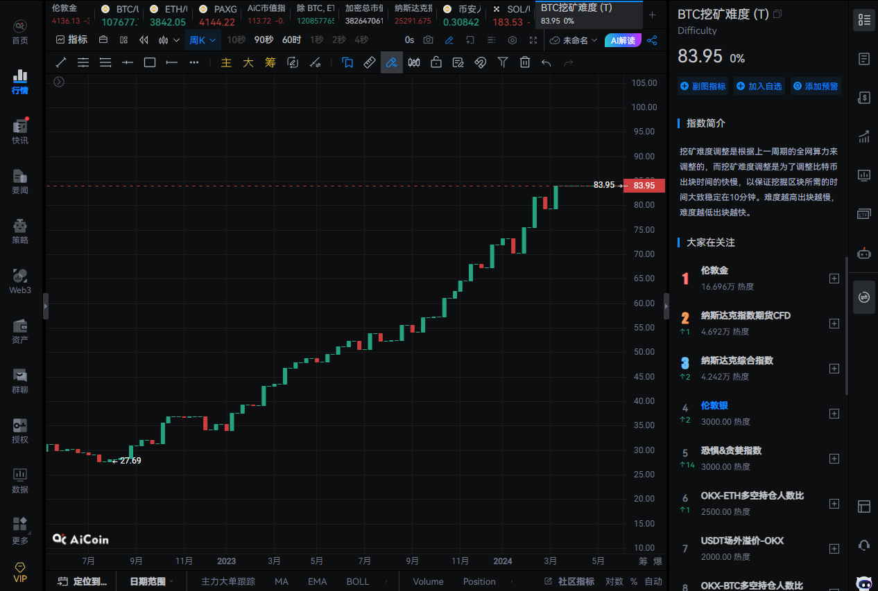 图3:比特币挖矿难度(数据来源于AiCoin 指数)