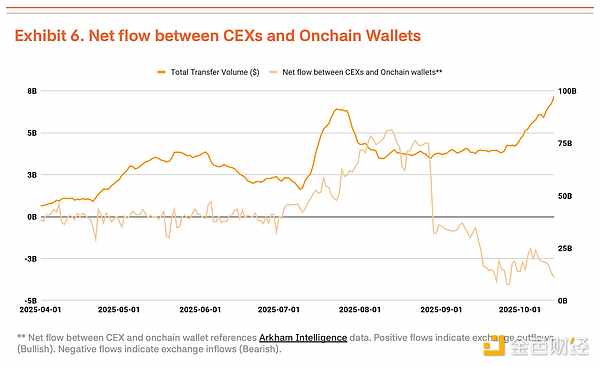 然而,我们不能单纯地将交易量的扩大视为积极的信号。近期流入中心化交易所的资金有所增加,这通常表明持有者准备抛售(图表 6)。在交易笔数和活跃用户等基本面指标没有改善的情况下,交易量的上升更多地表明在高波动性环境下短期资金的流动和抛售压力,而非真实需求的扩大。