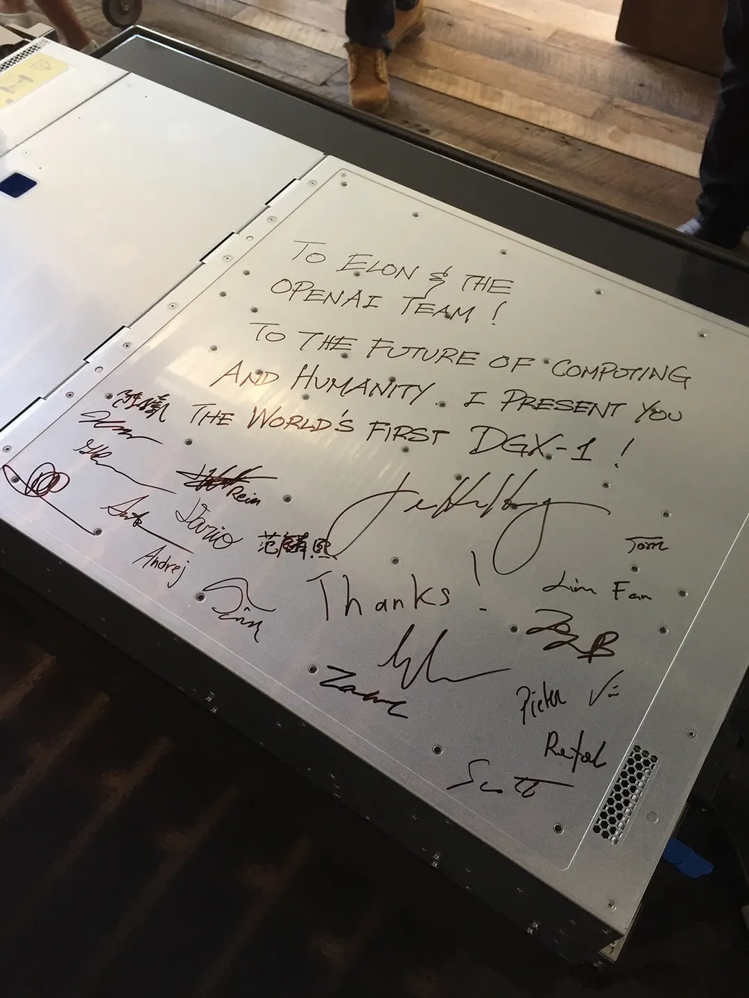 2016 年 8 月,一个历史性时刻诞生,英伟达向刚成立的 OpenAI 捐赠了英伟达的第一台 AI 超级计算机 DGX-1,黄仁勋本人亲自将这台计算机送到了 OpenAI 的办公室,当时的董事长埃隆·马斯克用开箱刀打开了包裹。
