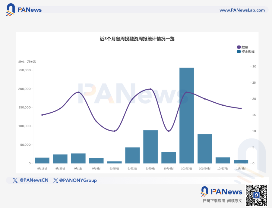 据 PANews 不完全统计,上周(10.27-11.2)全球区块链有17起投融资事件,资金总规模超0.92亿美元;此外,上市公司加密资产储备融资总额超4.68亿美元,概览如下概览如下: