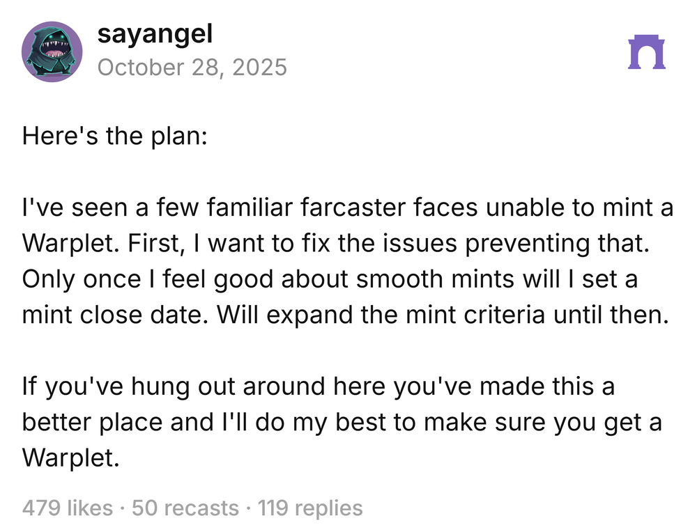 在这波热度下,Resolve VR 应用的联合创始人、也是 Farcaster 迷你应用(如 Livecaster 和 Harmonybot )的开发者Angel Say,推出了The Warplets NFT铸造活动。