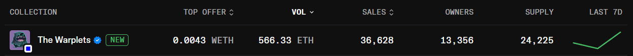 此外,Warplets系列在NFT市场上的表现也异常活跃。在短短的上线时间内,这个系列已经完成了超过36,000笔交易,总交易量达到566 ETH。