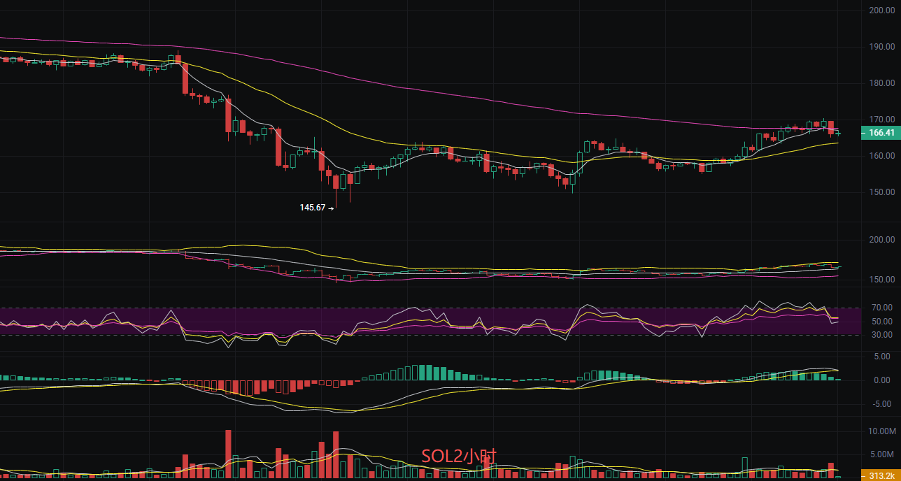 索拉拉目前价格为166.7,丽盈判断目前索拉纳SOL明确的上涨趋势,技术面信号强烈支持看涨观点。均线系统的多头排列与黄金交叉形成了趋势性共振,动能持续增强。吞没形态的出现进一步确认了看涨反转的有效性,