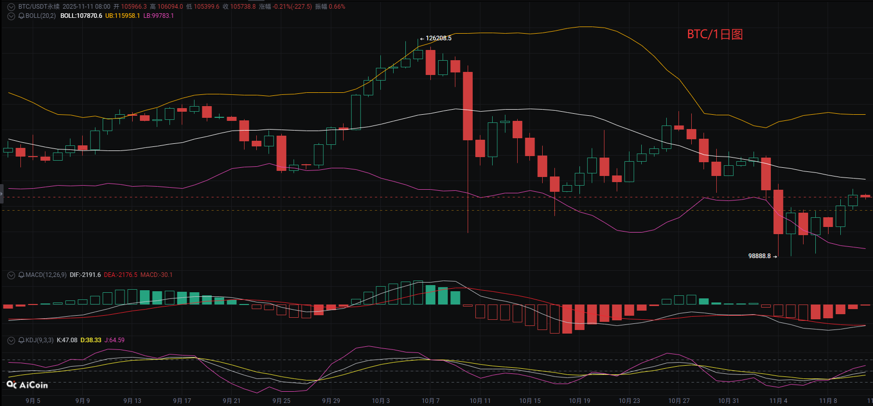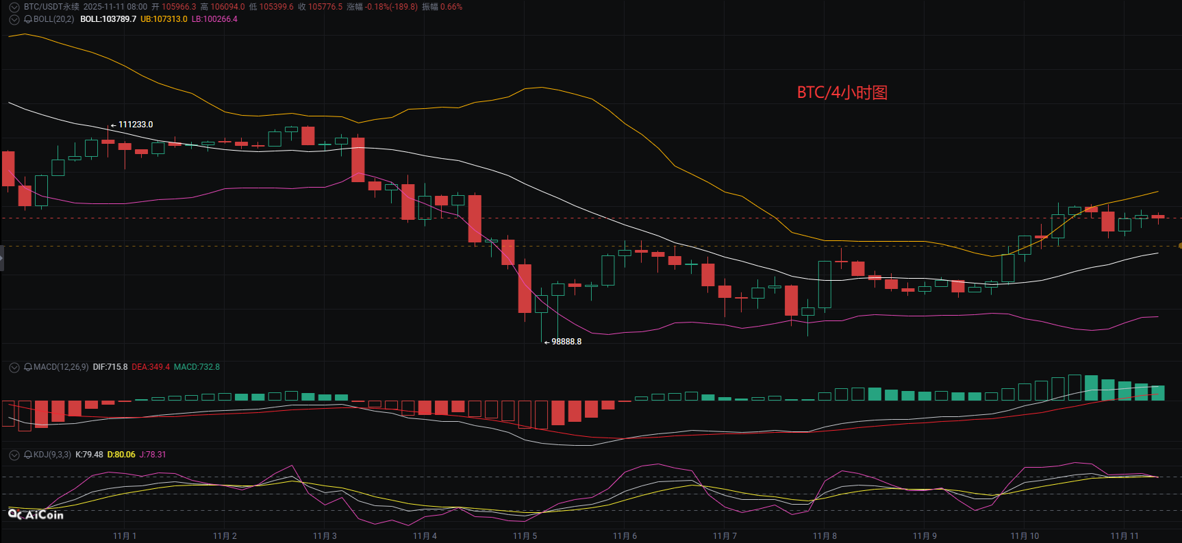 短周期小时图上看,目前布林带呈开口姿态,多空双方较为胶着,价格在区间内徘徊,暂时没有破位迹象,所以我们短线可以把握一波区间收益。上方压制关注107500日线中轴位置附近,下方支撑关注1035004小时中轴位置,注意短期行情较为反复,做单尽量控制风险。