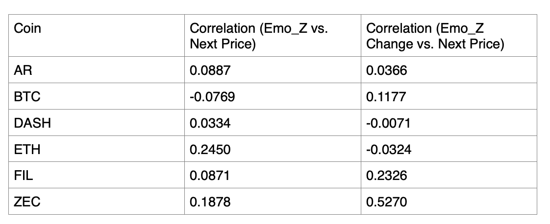 我们基于小时级数据,计算了情绪指标(Emo_Z)与下一小时价格变化率之间的皮尔逊相关系数。