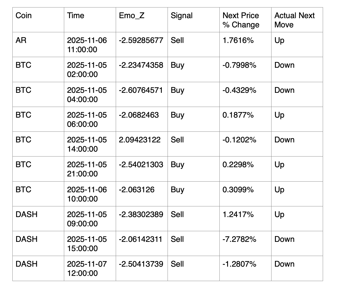 信号主要集中于 11 月 5 日至 11 月 7 日 匿名与存储板块的启动阶段,尤其是 ZEC、DASH、AR 多次进入极端情绪区间。