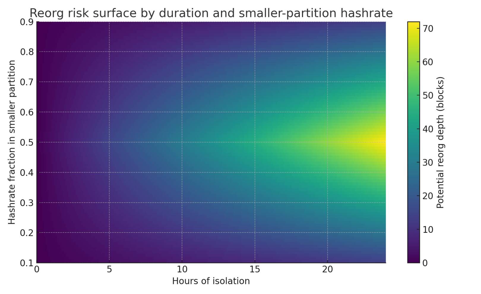 重组风险是 「时间」 与 「少数派分区哈希率」 的乘积,最危险的情况是 「长时间隔离 + 接近均等的哈希率分裂」