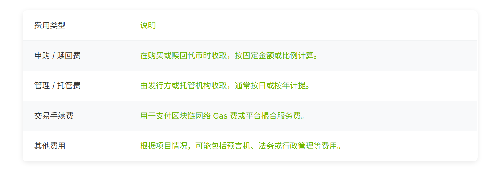任何投资产品都涉及成本,RWA 也不例外。清晰、透明的费用结构,有助于你准确评估真实收益。