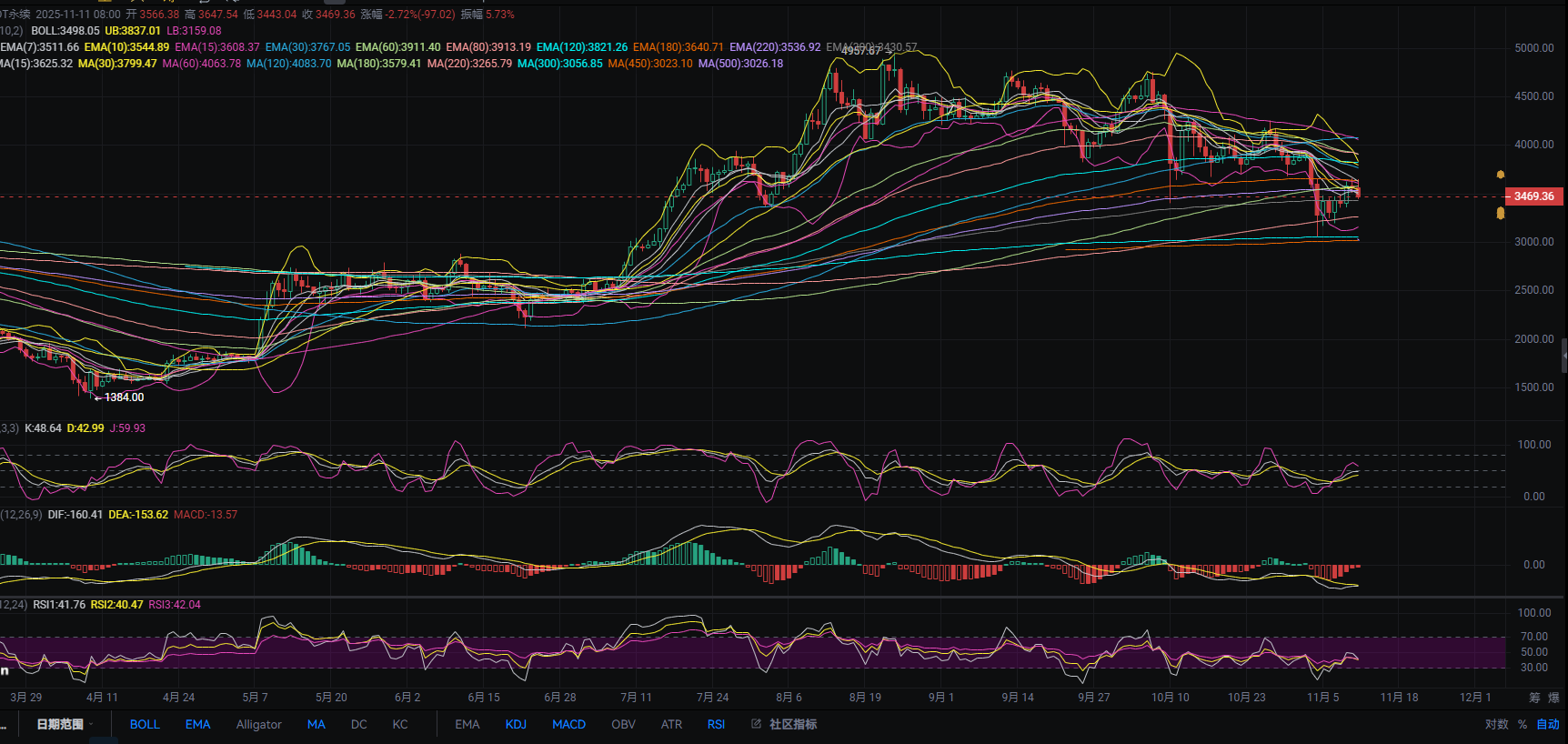 下方支撑的话继续看日线EMA300与3400关口区间支撑,防守于9号低点下方即可,当前级别布林带通道收口继续,上轨下压很厉害说明上方空间正在被压缩,变得越来越窄了,MACD中0轴下方量能收缩接近于0轴位置,快慢线收口放缓,KDJ三线上行放缓,RSI三线在接近50位置拐头向下,看来金叉成型是有点难度,日内需继续关注短线反弹力度与4小时死叉后强弱!