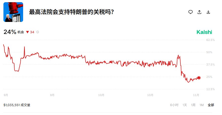 川普的关税政策目前正在最高院等待最终裁决。从 Kalshi 的预测数据来看,最高法院支持川普关税的概率只有 24% ,这也就说明除非是川普政府找到别的借口收税,否则这场持续了将近一年的税收闹剧很有可能是不成立的。