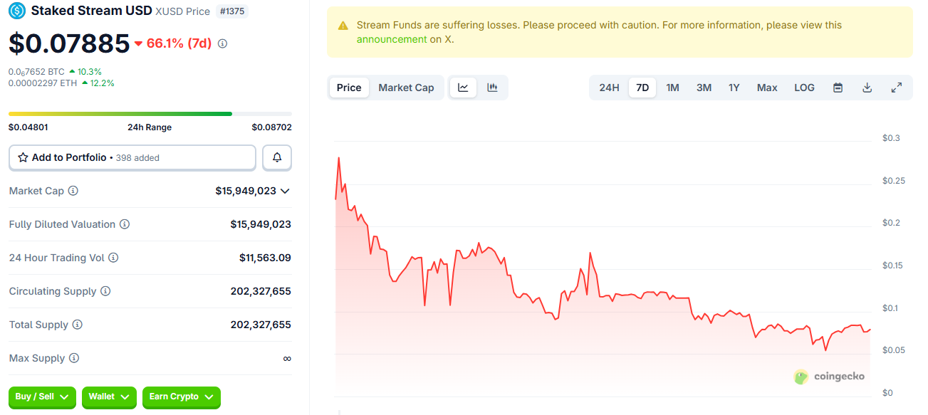 此次暴雷的直接导火索是外部资产管理失误与协议杠杆结构叠加引发的流动性危机。11 月 3 日,Stream Finance 披露外包基金经理亏损约 9,300 万美元;随后在 11 月 4 日暂停所有存取款操作。由于协议资产高度循环利用,这一链下亏损迅速削弱抵押能力,触发清算与恐慌性挤兑。短短 48 小时内,xUSD 从1美元暴跌至约 0.1 美元,流动性池几乎被抽空,多个协议因 xUSD 价值下跌而启动紧急停用与赎回程序。