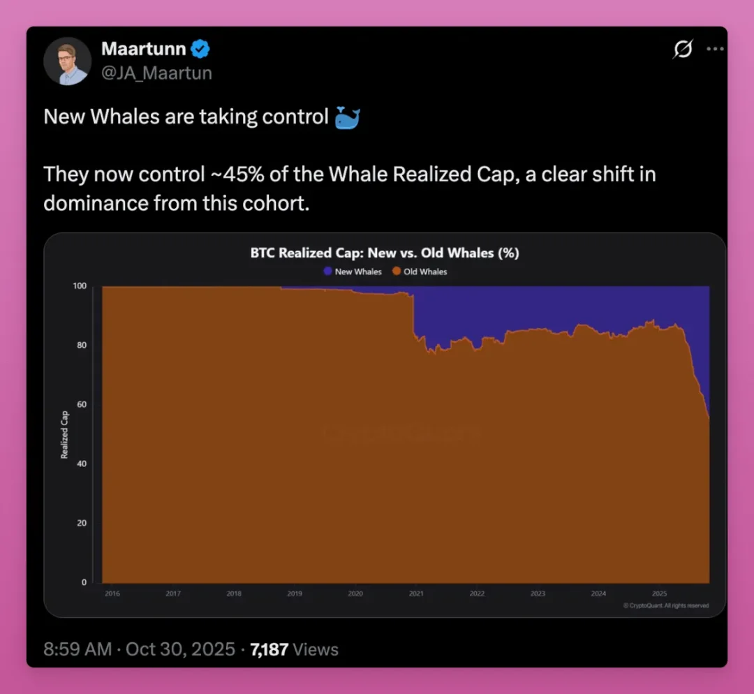 随着代币从元老持有者流向新买家,未实现利润价格持续攀升,新一代巨鲸正接管市场主导权。