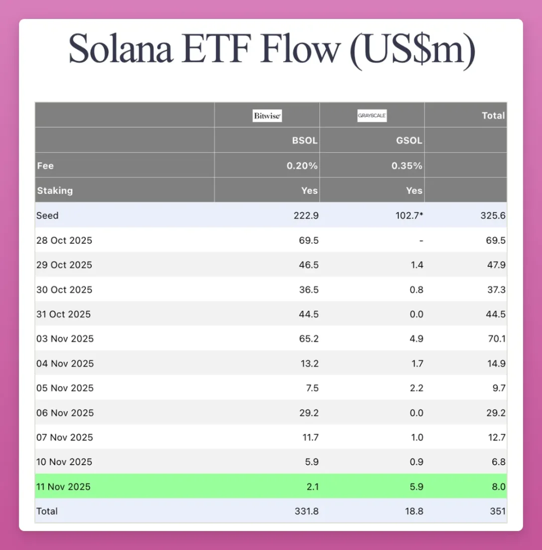 Solana 正在复制以太坊的机构化进程。上月美国现货 ETF 悄然上市却未引发市场热议,虽总规模仅 3.51 亿美元,但持续保持每日资金净流入。