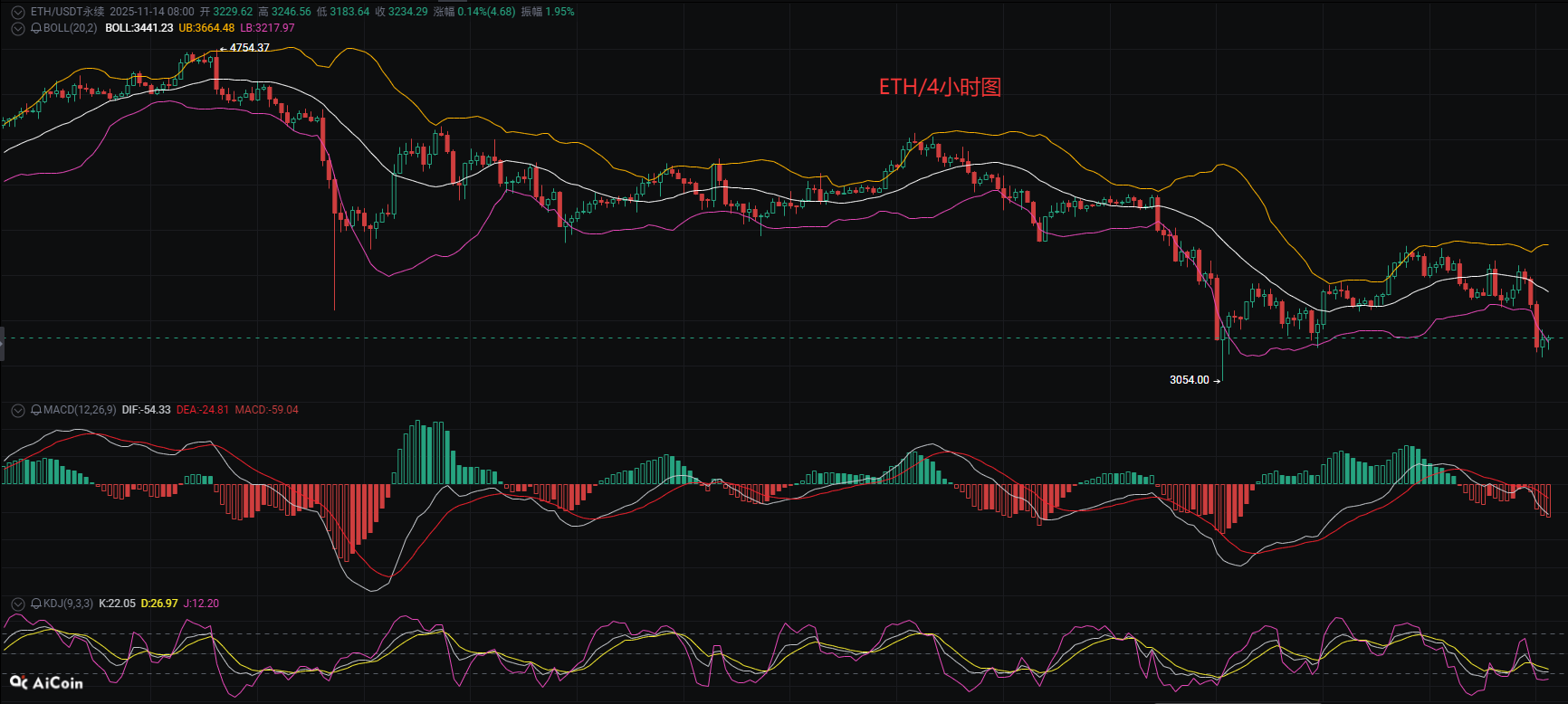 日线级别出现典型的“三只乌鸦”看跌形态,并于11月11日至13日连续三日收阴且伴随放量下跌,加剧了看空信号。与此同时,4小时级别走势中,价格以连续阴线有效跌破了EMA120关键支撑位,并依次击穿EMA7(3323)和EMA30(3433),形成空头发散的均线排列结构。在1小时级别上,行情于3250–3186区间构筑短期震荡平台,但未能有效突破前高3272,显示反弹动能不足。MACD指标进一步确认弱势,4小时级别DIF与DEA在零轴下方形成死叉,柱状体已扩大至-58.4;日线级别MACD同样呈现加速下行,数值达-37.3,整体技术面偏空。后续重点关注3330压制的突破情况,若能突破价格有望进一步向3400区域迈进,反之日内还是有望延续下行,再度回撤。日内行情由于这波反弹,目前是再度进入盘整,所以思路建议高空低多即可。