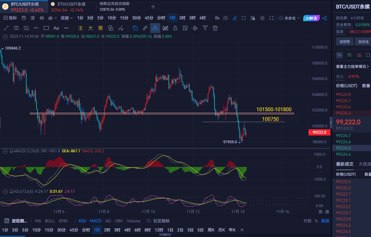 操作建议:大饼反弹100750-101100附近空,防守101800,目标看到99300-99000附近,破位看98700-98300附近,不破接多。