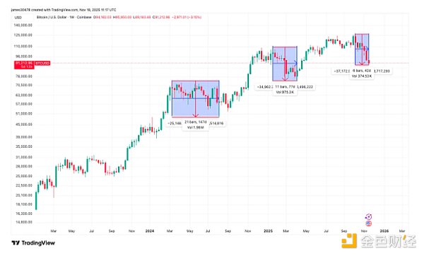 James van Straten 解释说,这是比特币本轮周期中的「第三次 30% 回调」。每一次回调,从峰值到谷底的时间都在缩短,这加速了市场恐慌情绪的蔓延。