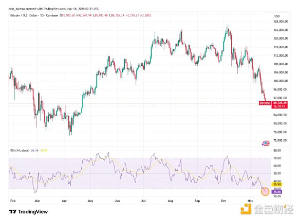 CoinBureau 数据显示,「比特币日线 RSI 指标已跌至 26,为 2 月份以来的最低水平,表明比特币已进入超卖区域。」