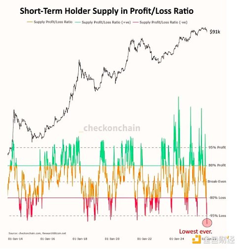 Quinten Francois 指出,类似的动态也发生在短期持有者的盈亏供应中。我们看到,过去 155 天内购买的所有代币中,超过 95% 目前都处于亏损状态。